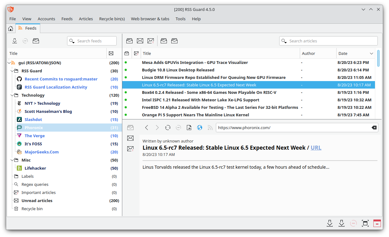 RSS Guard 是一款多功能的RSS/ATOM提要阅读器,支持Windows、Linux、BSD、OS/2和macOS等操作系统。它能够处理RSS/ATOM/JSON/iCalendar/Sitemap等多种格式的提要,并兼容众多在线提要服务。此外,RSS Guard还具备播客播放器的功能,利用内置的基于mpv或ffmpeg的媒体播放器,可以播放所有内容。